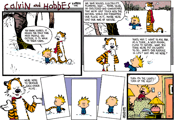 We’re Here to Devour Each Other Alive BDrakefordUncategorizedLeave a comment Thank you Mr. Watterson for sharing Calvin and Hobbes. Share this: Click to share on X (Opens in new window) X Click to share on Facebook (Opens in new window) Facebook Like Loading... Related