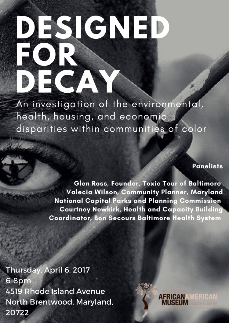 Curious to learn more about environmental justice and the impact land use has on communities of color? Meet me at the Prince George’s African American Museum and Cultural Center this Thursday, April 6th at 6pm for Designed for Decay. Designed for Decay investigates the environmental, health, housing, and economic disparities within communities of color. The […]