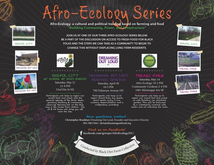 Join the Black Dirt Farm Collective for Afro-Ecology Series, hosted by Dreaming Out Loud, Soilful City, and THEARC Farm. The series is part discussion, political training, and a community- and movement-building exercise — including work on a specific project that will help each partner site have a successful growing season. Below are the dates, times, and locations for each partner […]